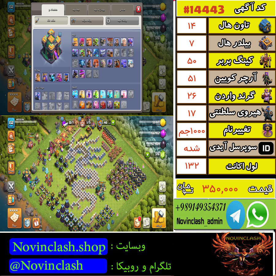 لطفا قبل از خرید به پشتیبانی نوین کلش در تلگرام یا روبیکا پیام بدید .این  اکانت پس از خرید در تلگرام یا روبیکا توسط آدمین تحویلی نوین کلش به شما تحویل داده میشود. در صورتی که پیامی دریافت نکردید به شماره 09149354371 در تلگرام یا روبیکا پیام بدید