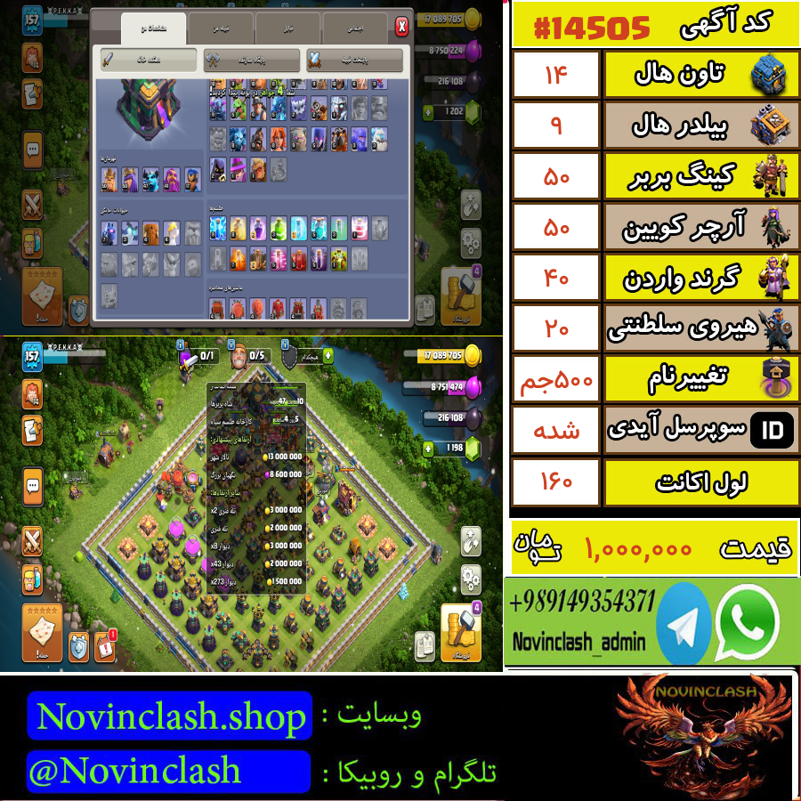 لطفا قبل از خرید به پشتیبانی نوین کلش در تلگرام یا روبیکا پیام بدید .این  اکانت پس از خرید در تلگرام یا روبیکا توسط آدمین تحویلی نوین کلش به شما تحویل داده میشود. در صورتی که پیامی دریافت نکردید به شماره 09149354371 در تلگرام یا روبیکا پیام بدید