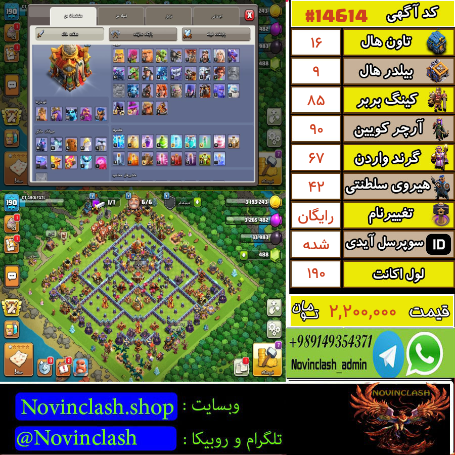 لطفا قبل از خرید به پشتیبانی نوین کلش در تلگرام یا روبیکا پیام بدید .این  اکانت پس از خرید در تلگرام یا روبیکا توسط آدمین تحویلی نوین کلش به شما تحویل داده میشود. در صورتی که پیامی دریافت نکردید به شماره 09149354371 در تلگرام یا روبیکا پیام بدید
