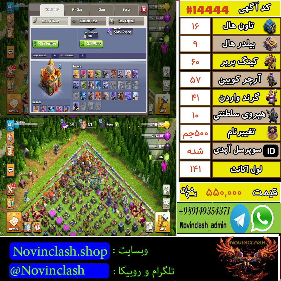 لطفا قبل از خرید به پشتیبانی نوین کلش در تلگرام یا روبیکا پیام بدید .این  اکانت پس از خرید در تلگرام یا روبیکا توسط آدمین تحویلی نوین کلش به شما تحویل داده میشود. در صورتی که پیامی دریافت نکردید به شماره 09149354371 در تلگرام یا روبیکا پیام بدید