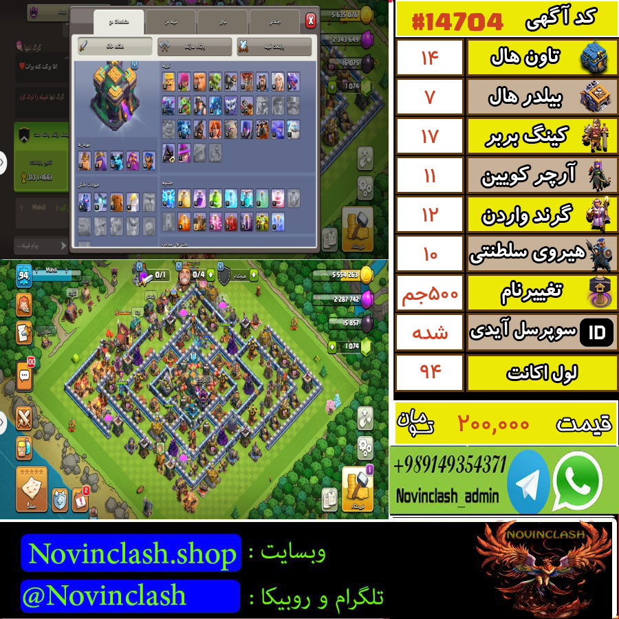 لطفا قبل از خرید به پشتیبانی نوین کلش در تلگرام یا روبیکا پیام بدید .این  اکانت پس از خرید در تلگرام یا روبیکا توسط آدمین تحویلی نوین کلش به شما تحویل داده میشود. در صورتی که پیامی دریافت نکردید به شماره 09149354371 در تلگرام یا روبیکا پیام بدید