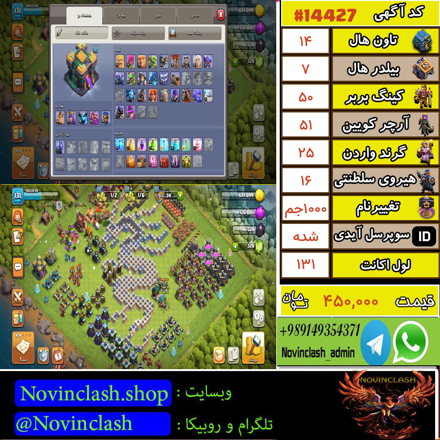 خرید اکانت کلش اف کلنز تانهال 14 لول 131 کد 14427قبل از اقدام به خرید و فروش حتماً قوانین سایت را مطالعه کنید.