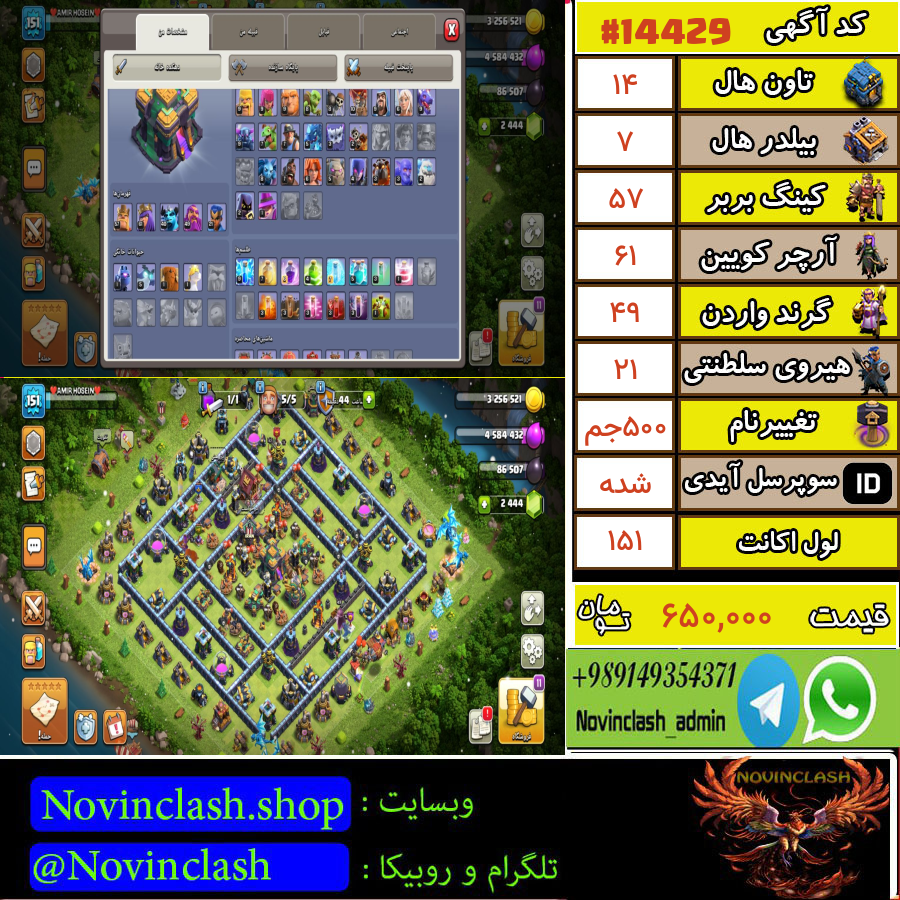 خرید اکانت کلش اف کلنز تانهال 14 لول 151 کد 14429قبل از اقدام به خرید و فروش حتماً قوانین سایت را مطالعه کنید.