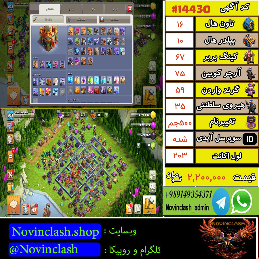 گزارش قیمت برای خرید اکانت کلش اف کلنز تانهال 16 لول 203 کد 14430